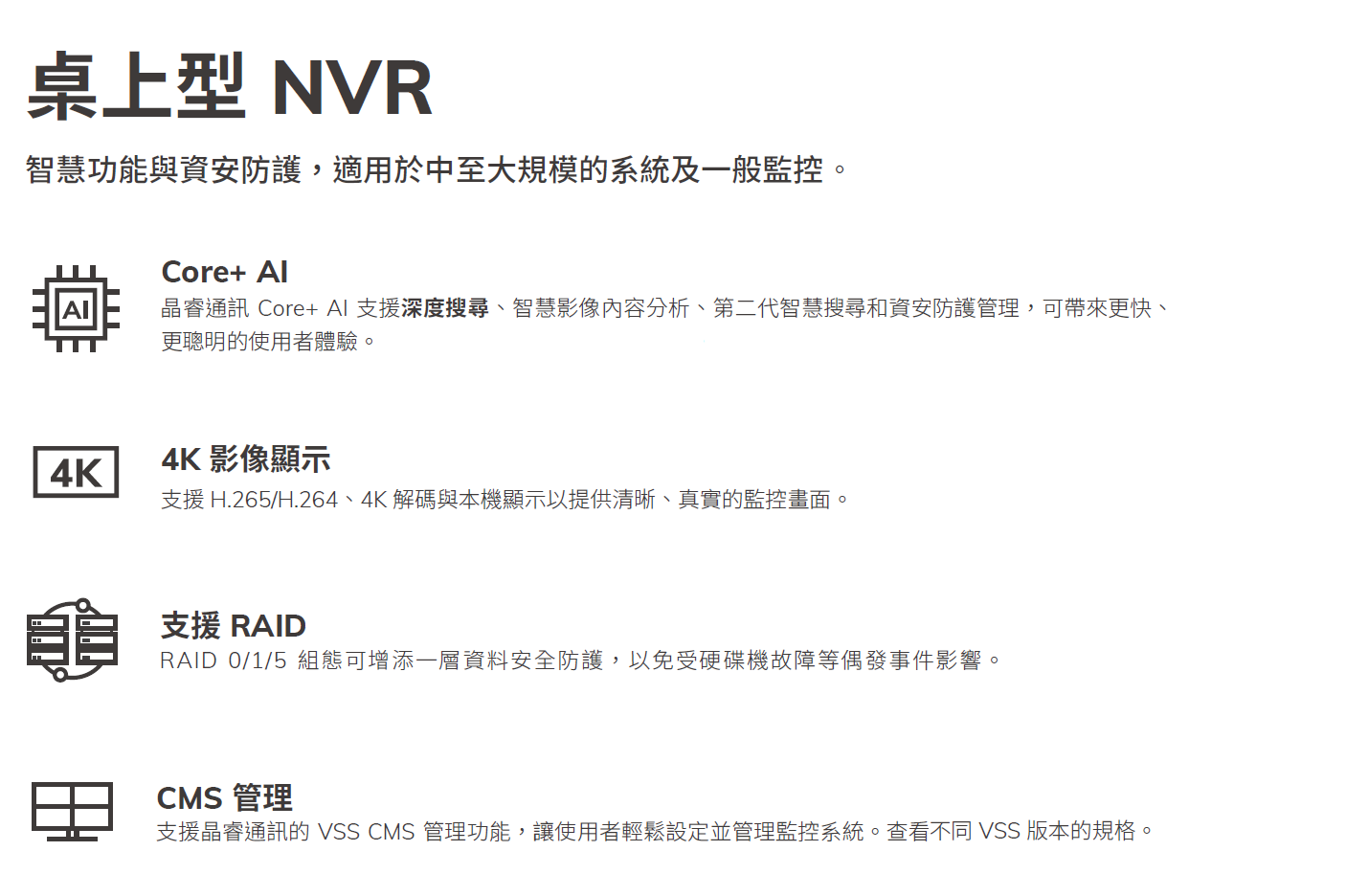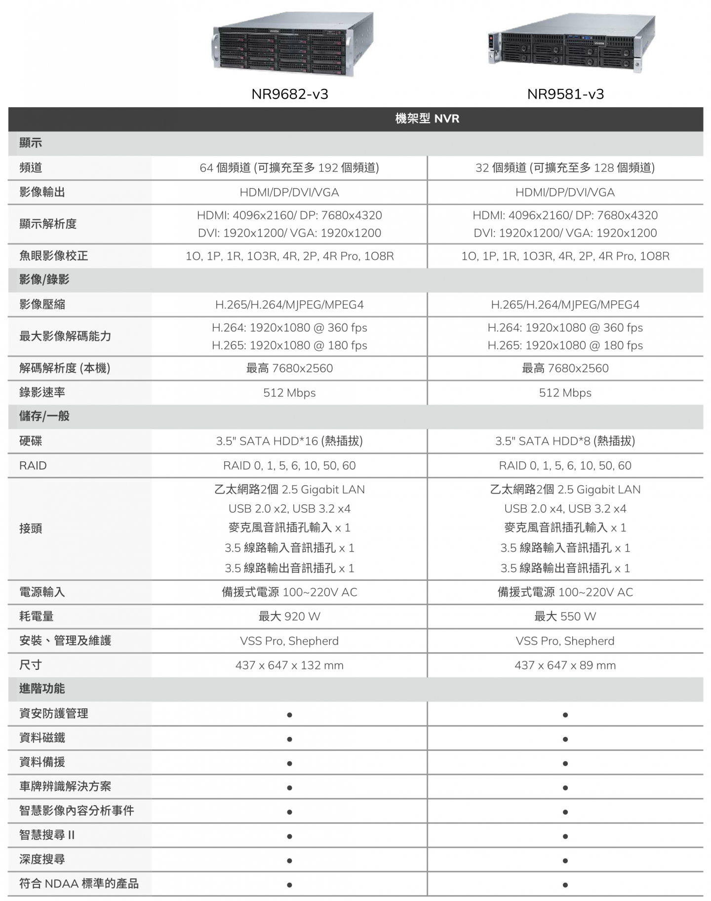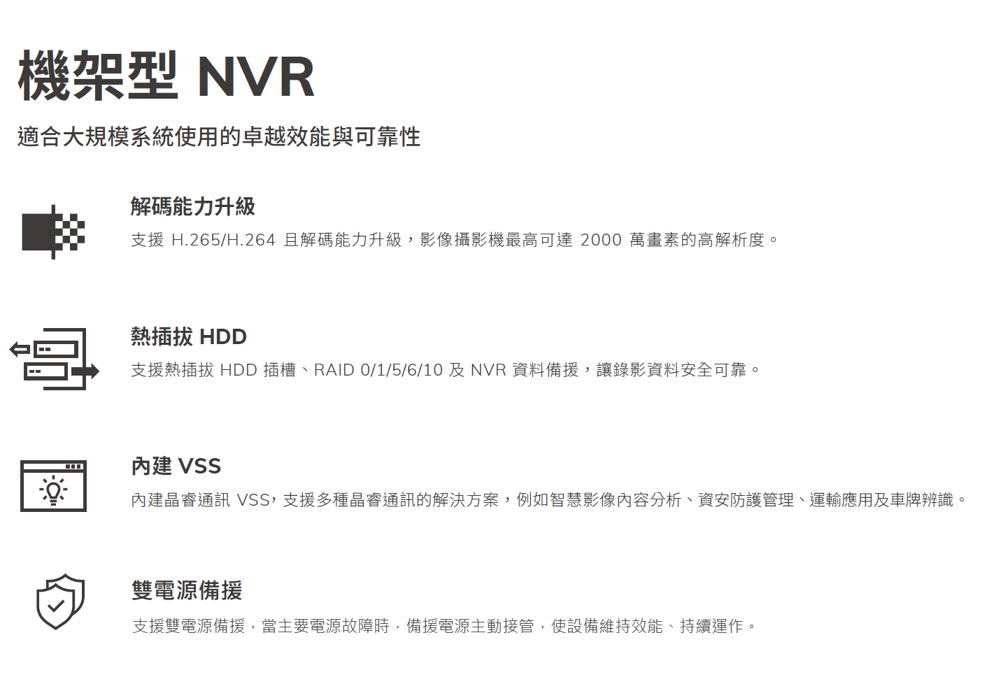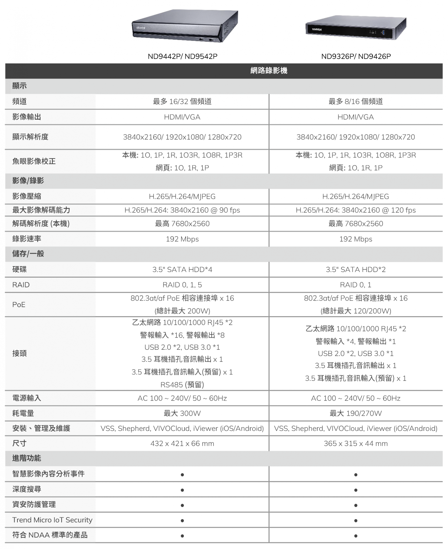 8/16/32/64/128/192CH錄影主機 H.265/H.264 影像壓縮技術 深度搜尋 (特徵搜尋、場景搜尋) 智慧影像分析事件搜尋、VCA 計數解決方案 趨勢科技資安防護 & 資安管理解決方案 人流控管解決方案 VIVOCloud App & VSS 台灣製造