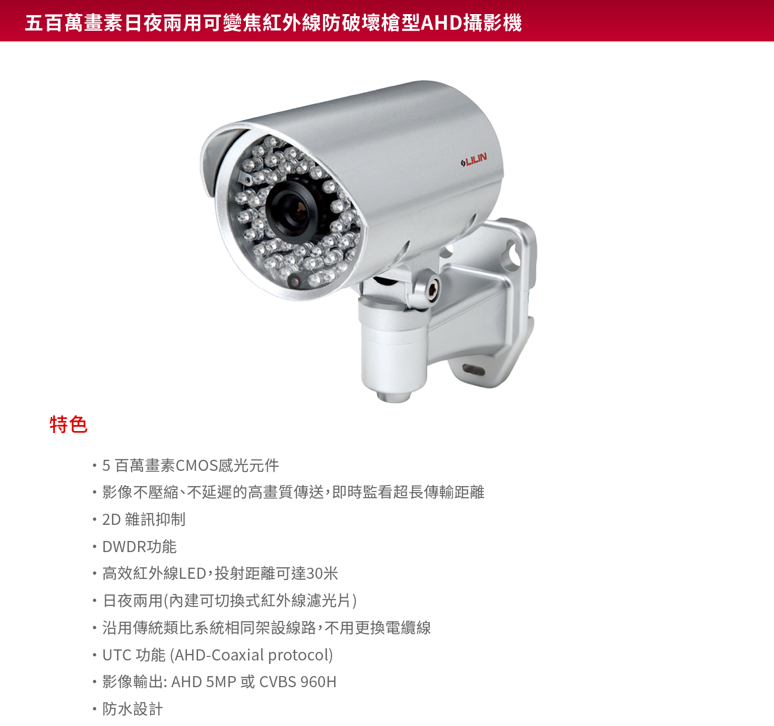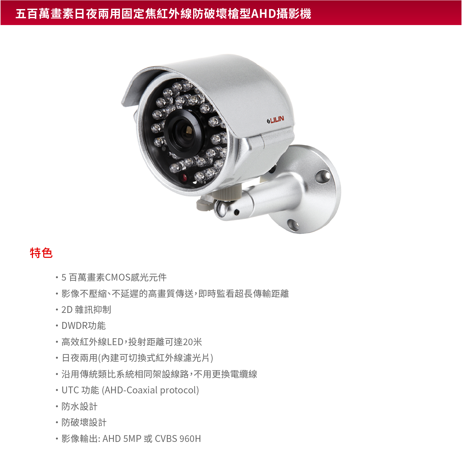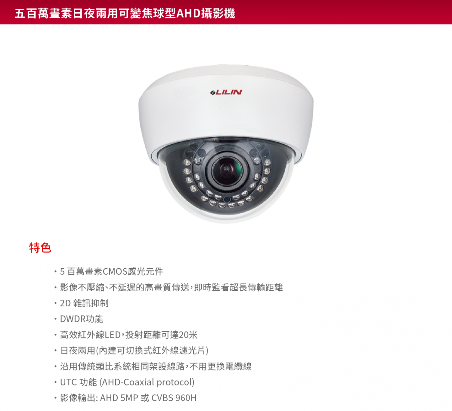 雙影像輸出: AHD / TVI / CVI / CVBS 影像不壓縮、不延遲的高畫質傳送,即時監看超長傳輸距離 同軸電纜(3C/5C) 沿用傳統類比系統相同架設線路,不用更換電纜線 照度低於10Lux 時,感應器自動開啟紅外線光源 UTC 功能 (AHD-Coaxial protocol)