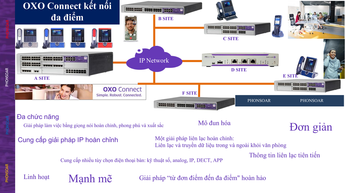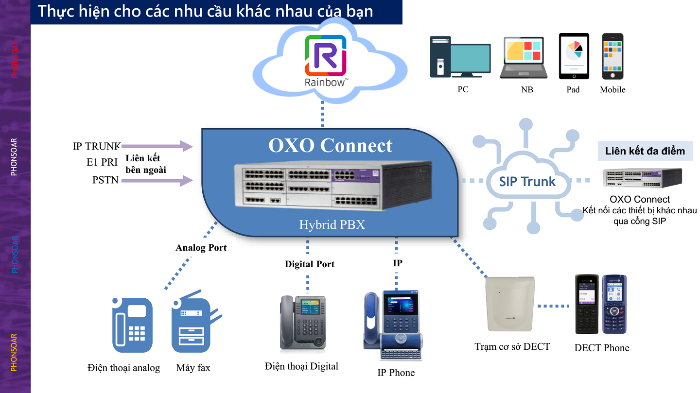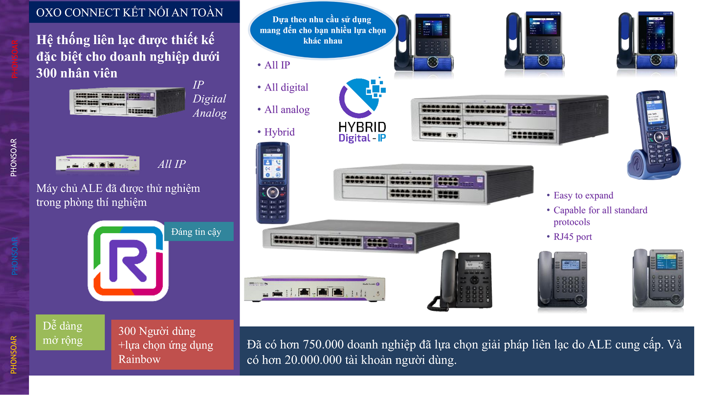 Alcatel-Lucent Enterprise OXO Connect là một hệ thống điện thoại có thể mở rộng dựa trên nền tảng truyền thông hội tụ dựa trên web, mạnh mẽ dành cho các doanh nghiệp có tối đa 300 người dùng. OXO Connect tích hợp với các dịch vụ cộng tác đám mây công cộng Alcatel-Lucent Enterprise Rainbow ™.