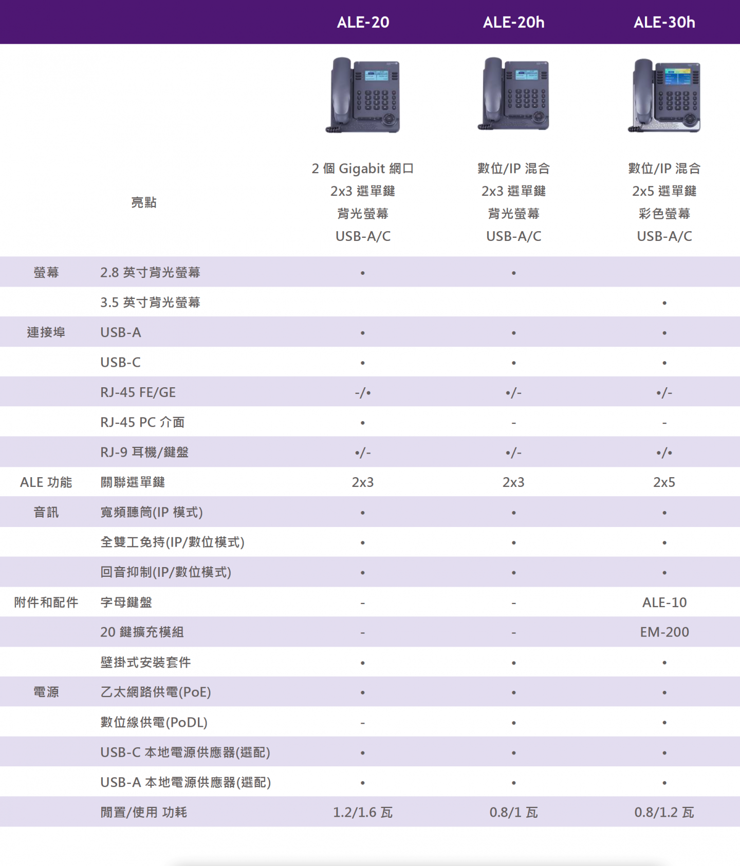 用戶可以將話機應用在家中或辦公室的 ALE 通訊伺服器上。 ALE-20h 和 ALE-30h 話機內建 RJ-45 IP 介面和數位介面,並提供自動偵測模式。