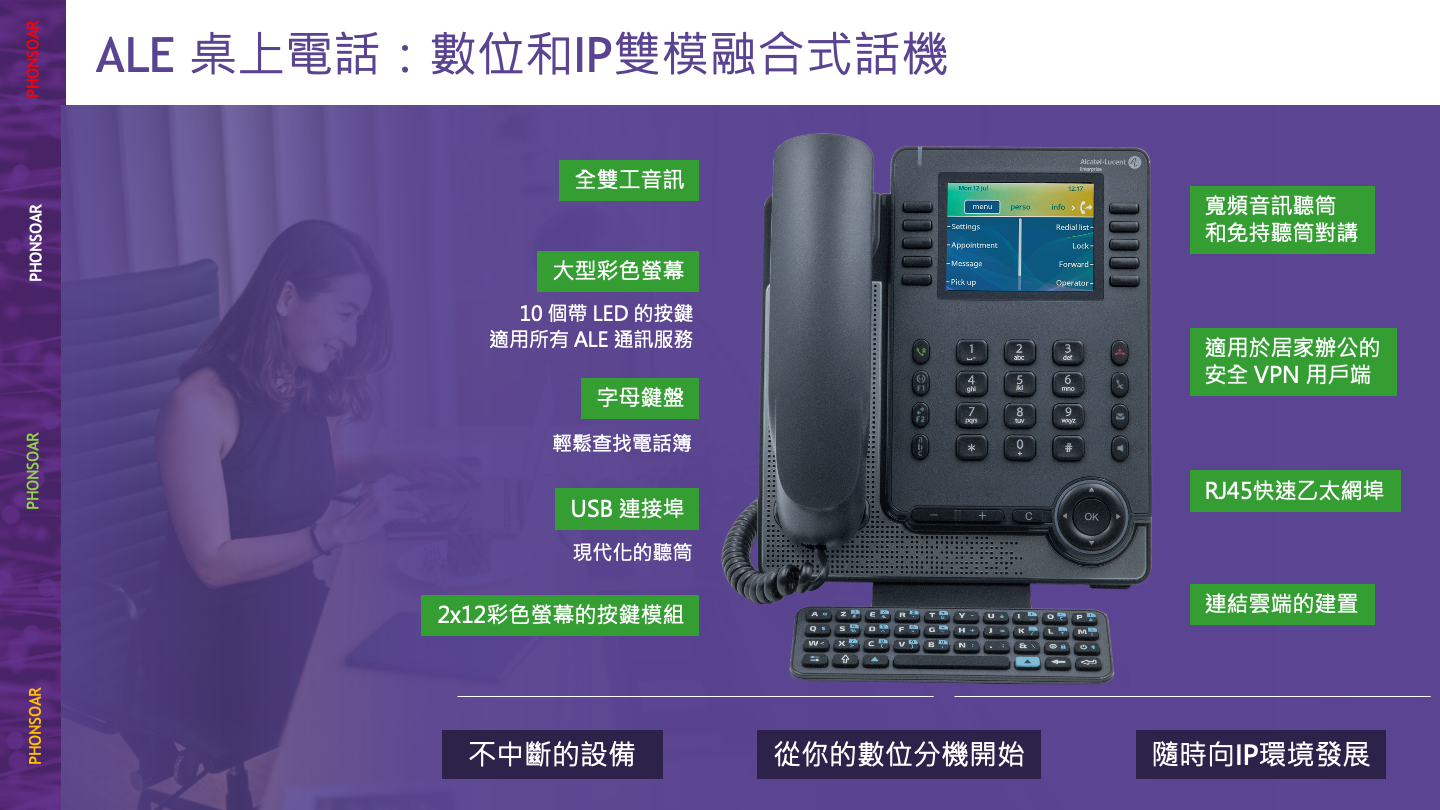 ALE 數位/IP兩用桌面話機使用方便,配有大螢幕、功能按鍵和四向按鈕。用戶可以選配字母鍵盤,輕鬆快速地與同事和客戶聯繫。